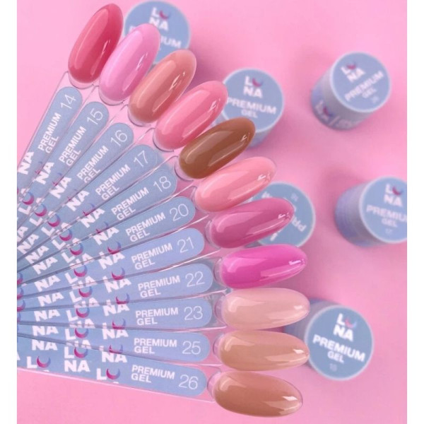 Luna Premium Gel, 30 мл – гель для нарощування, створення необхідної форми та довжини нігтів. Має середню тиксотропну консистенцію, яка забезпечує контроль та зручність у нанесенні. Не надто густу та не рідку, яка не розтікається. Завдяки середній пігментації перекриває вільний край. Підходить для зміцнення, нарощування на верхні форми та в техніці без запилення. Гель безкислотний після застосування не шкодить натуральним нігтям. Не викликає печіння під час полімеризації. При ударах не тріскається і добре тримає арку.